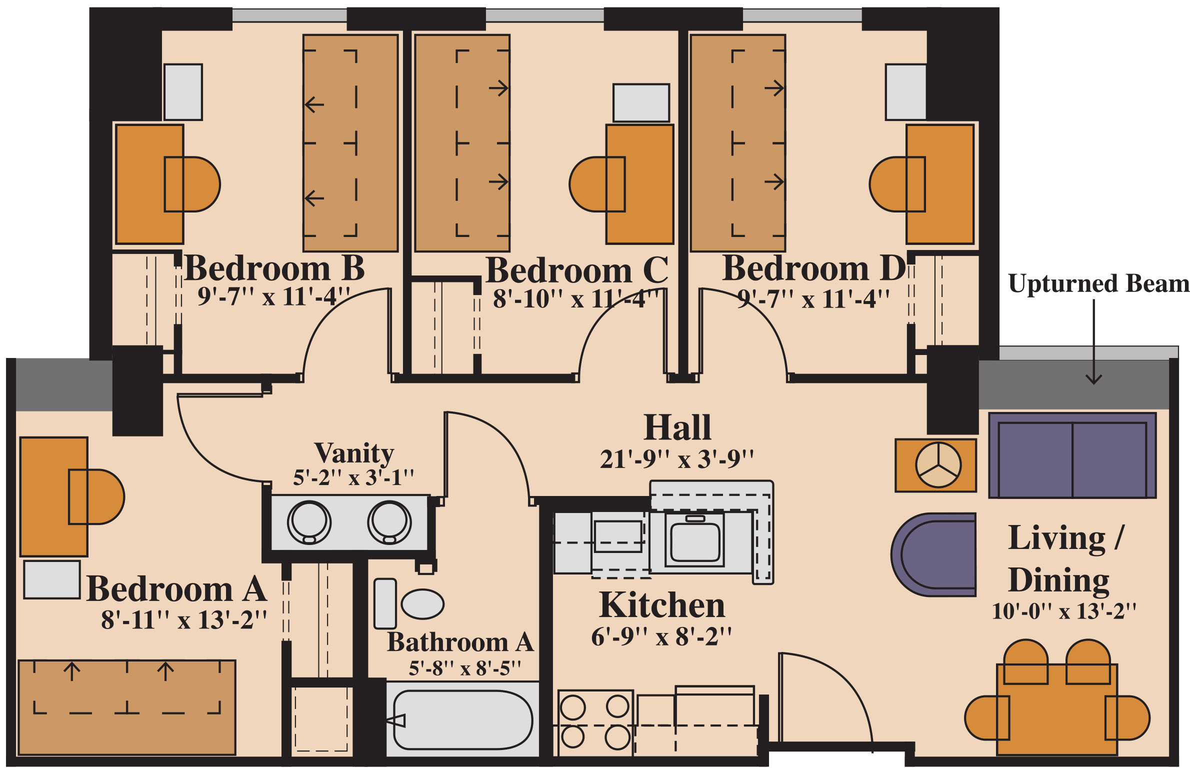 Double occupancy apartments in Campus Village Building B include a shared living area, 2 bathrooms, a full kitchen with a stove, an oven, a microwave and a full size refrigerator. Double occupancy rooms have one set of twin, extra long beds, which can either be bunked or separated.