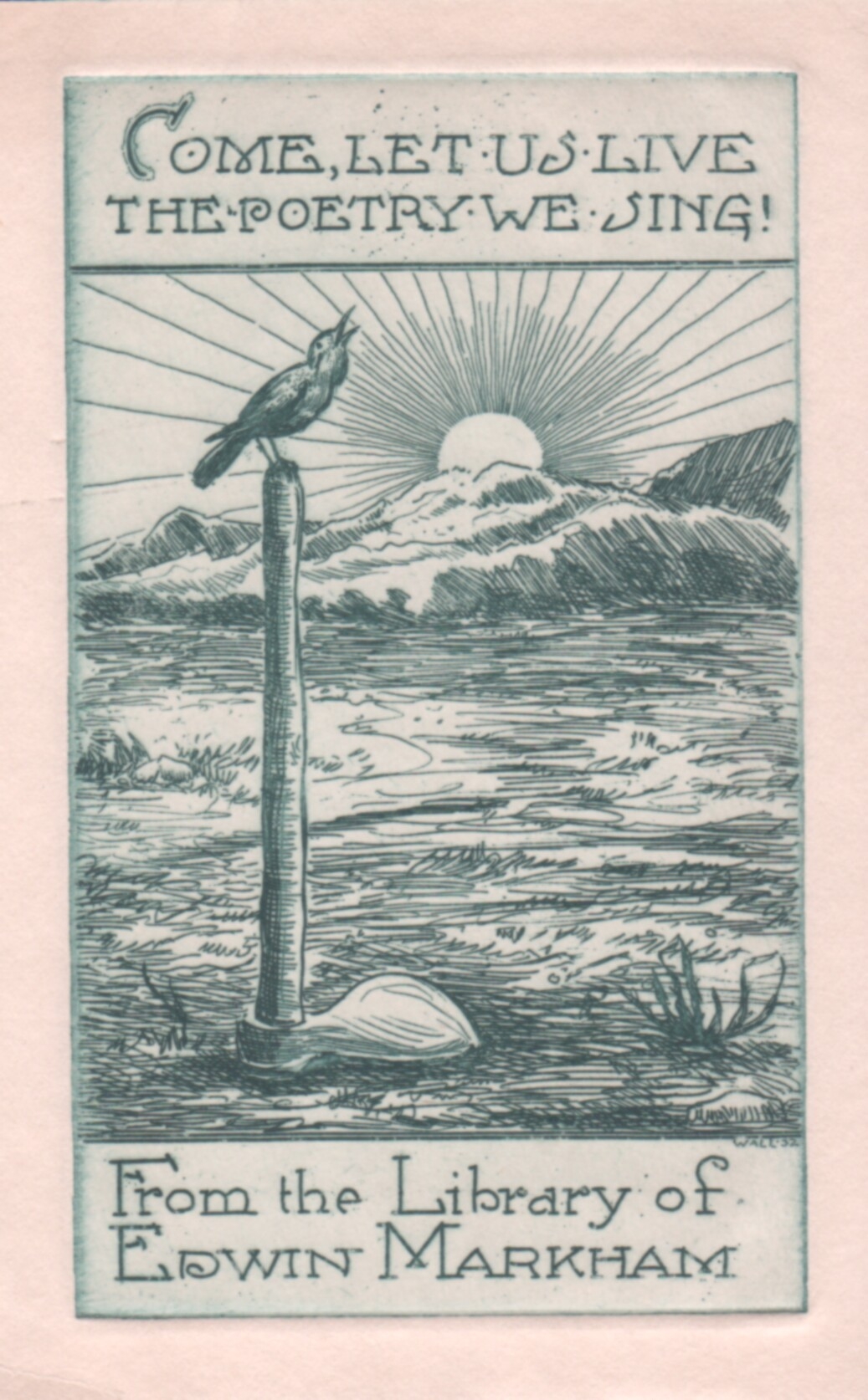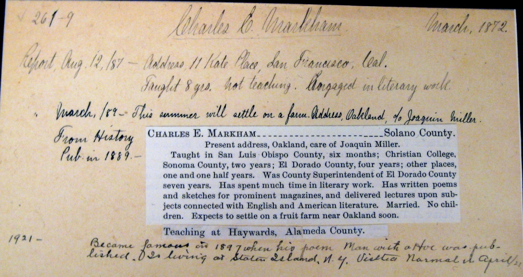 This is Mr. Markham's "placement card" maintained by the California State Normal School. These cards tracked the graduation and movement/career of the graduates. Courtesy of Special Collections & Archives, San Jose State University. Reproduced with permission courtesy of the Special Collections & Archives, San Jos� State University Library. Bookplate The Markham plaque on the west side of Tower Hall. Click here for additional photos of Mr. Markham. |